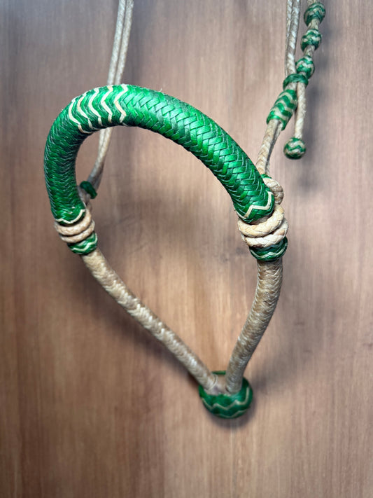 Green 5/8” rawhide braided bosal with natural accents & matching rawhide hanger with black knots