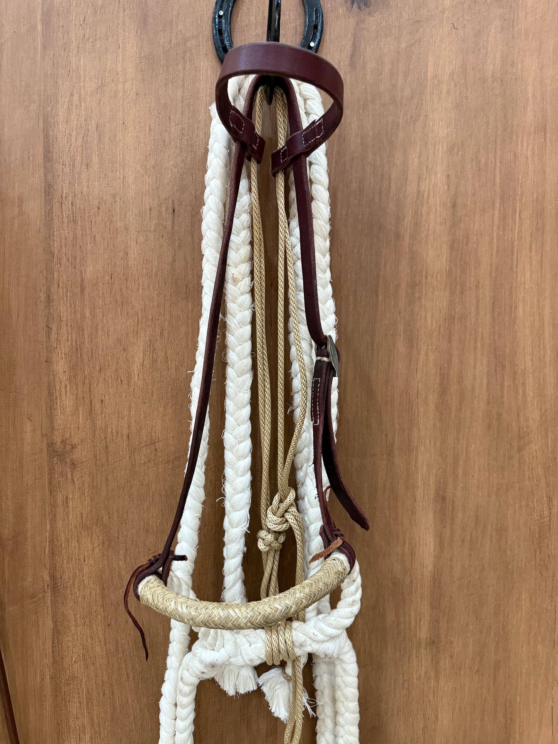 Hackamore con cabezada frontal y ahogador. Bozal de algodón con cuero crudo tejido y riendas largas de algodón de 8 pies.