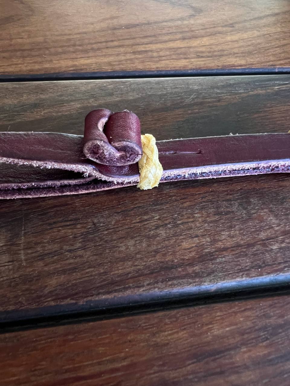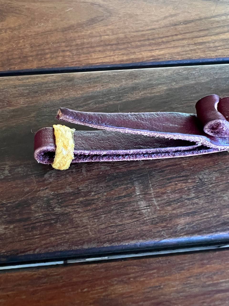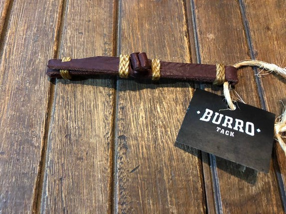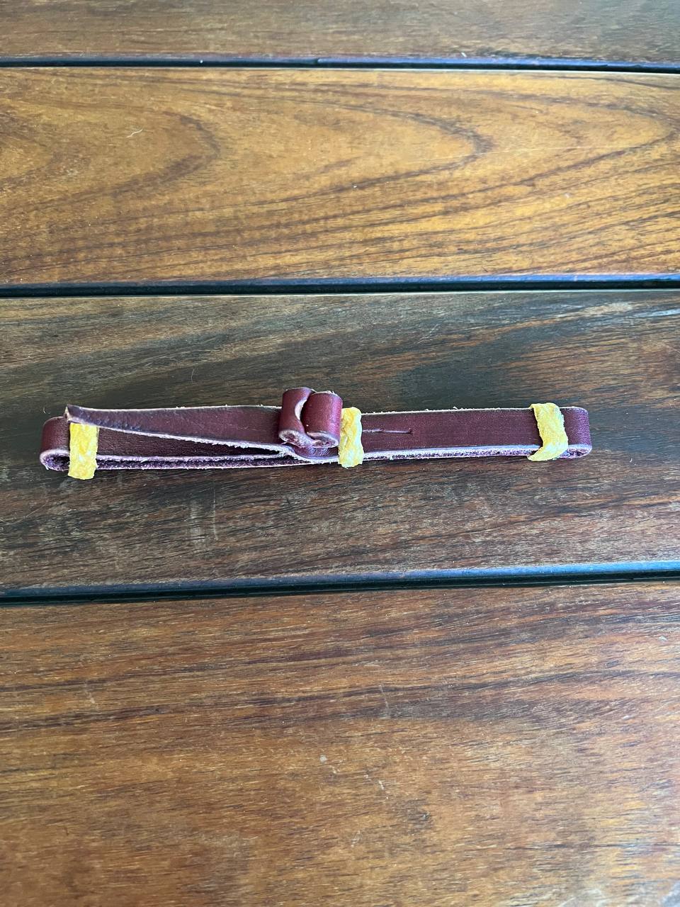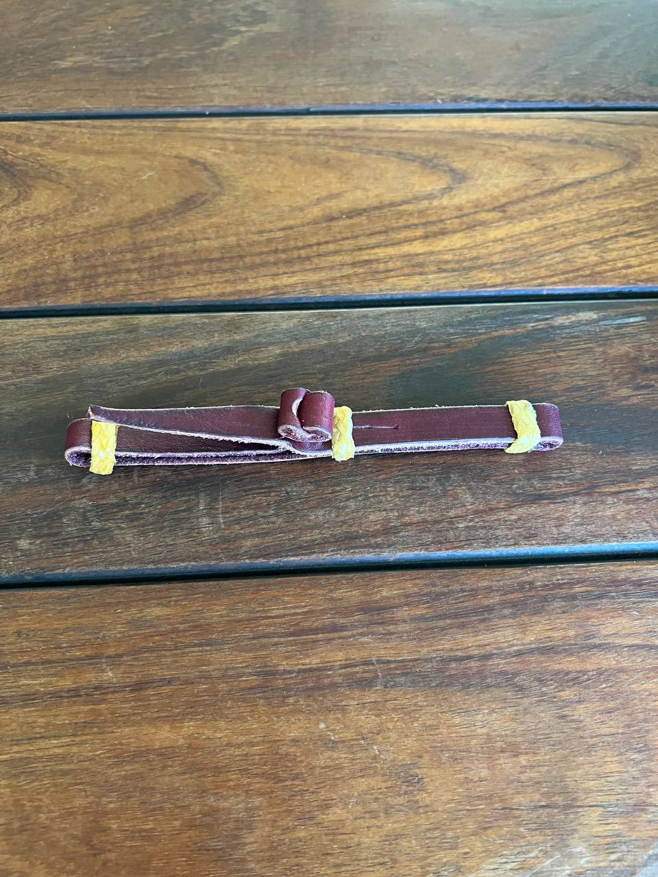 Manea en piel con doble botón y detalles en cuero crudo tejido finamente a mano.