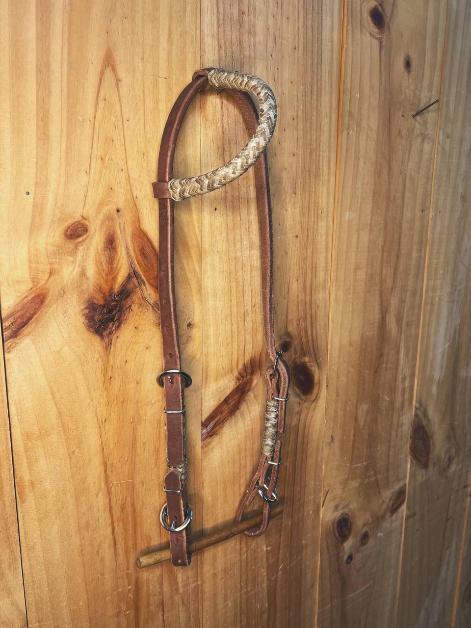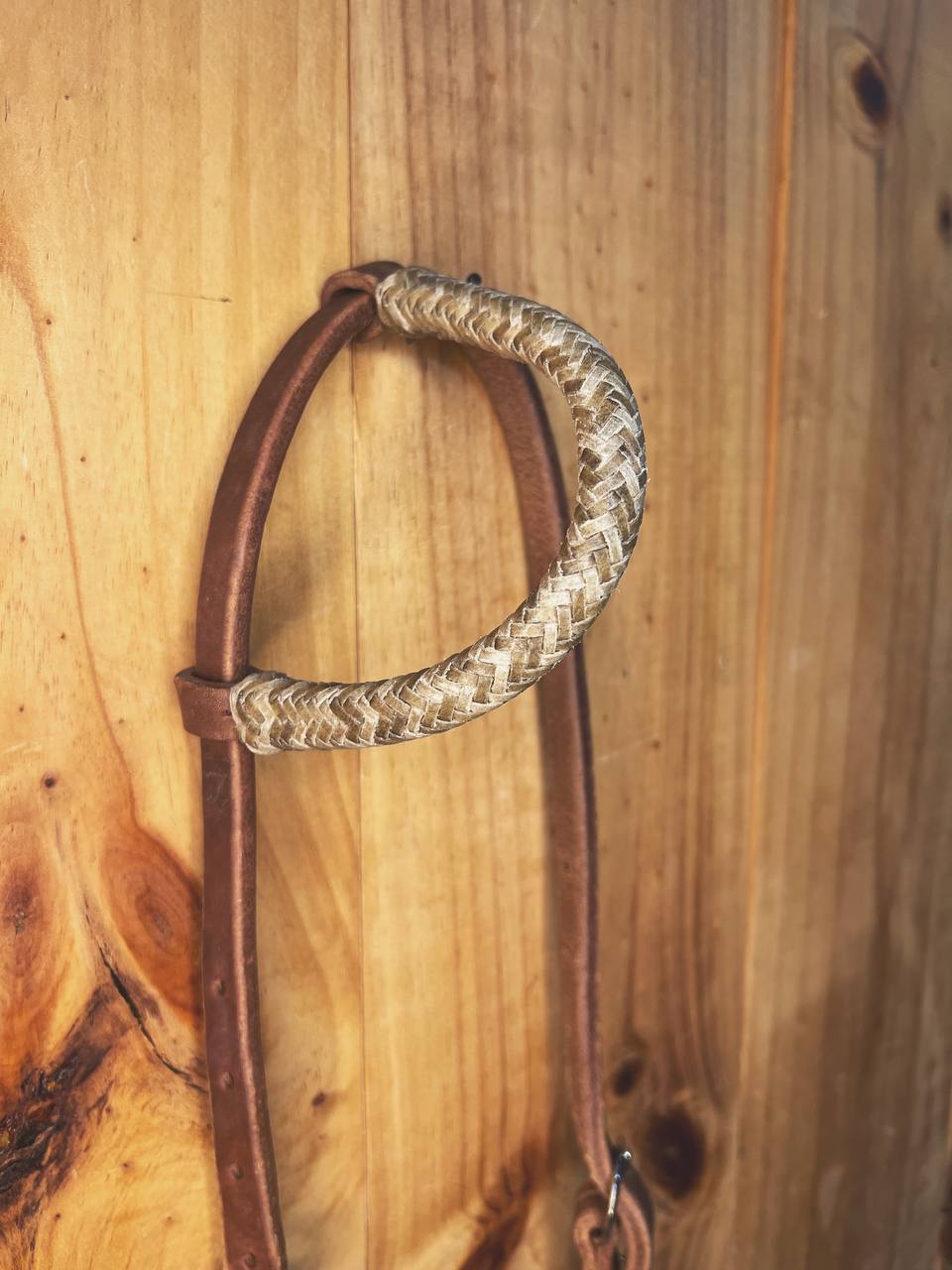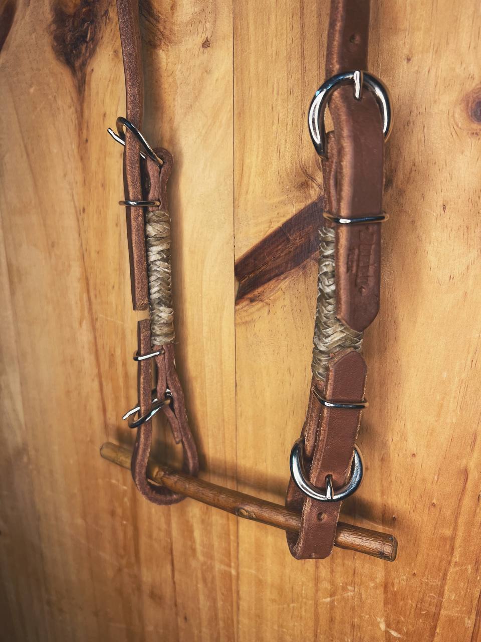 Cabezada de una oreja de 5/8" de grosor en piel "Old Harness" esta piel es mas gruesa que el harness. Dos hebilla de cada lado, para ajustar mejor la medida a la cabezada del caballo. Y tejido finamente a mano de cuero crudo, en ambas terminaciones y oreja.