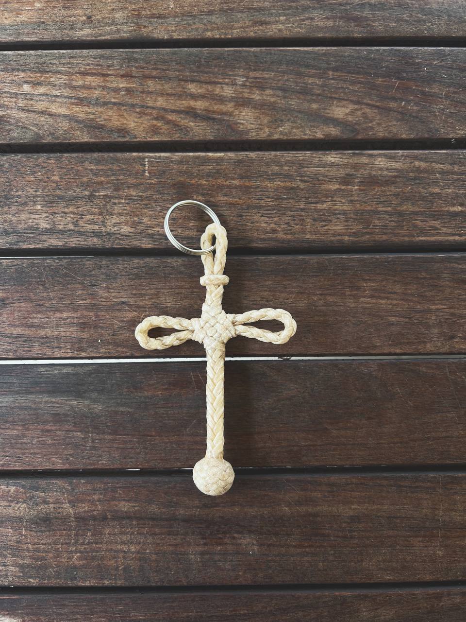 Llavero tejido finamente a mano de cruz de cuero crudo.