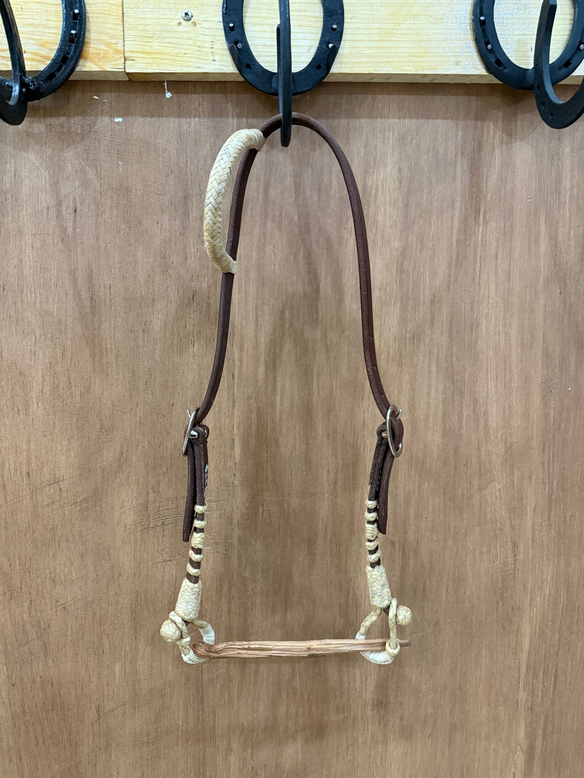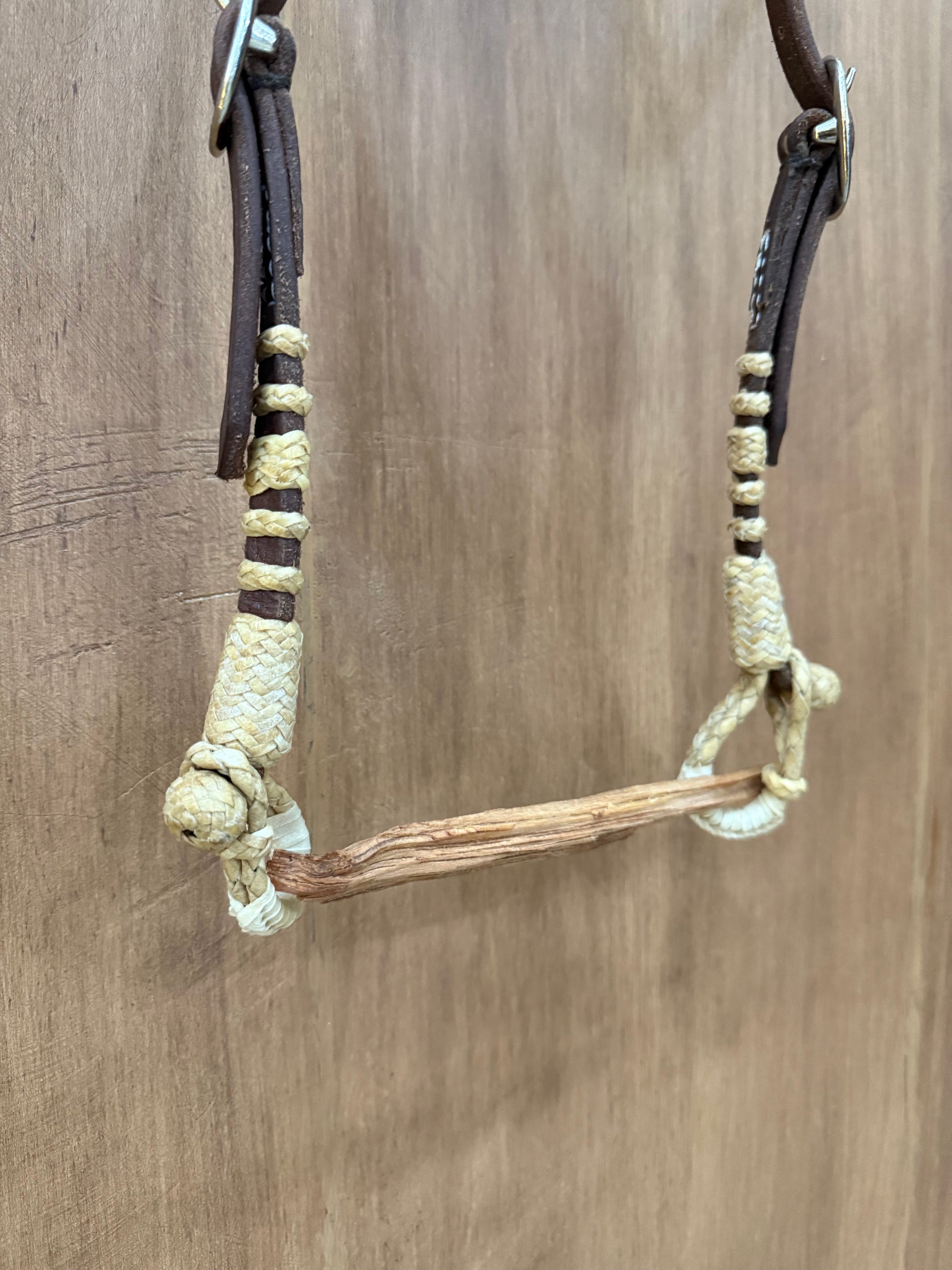 Cabezada de oreja con dos hebillas por ambos lados. Con oreja tejida de cuero crudo y ambas terminaciones en tejido de cuero crudo.