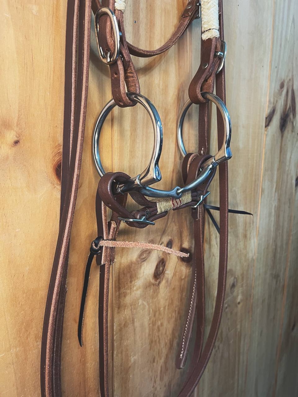 un filete snaffle en argolla D lisa y una barbada o traba de 2 hebillas con cuero crudo tejido y tonos rojo.