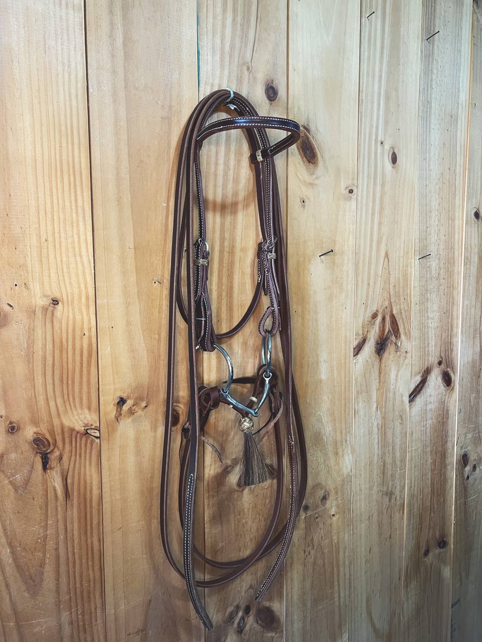y una barbada con mota de cerda de caballo y un botón de cuero crudo.